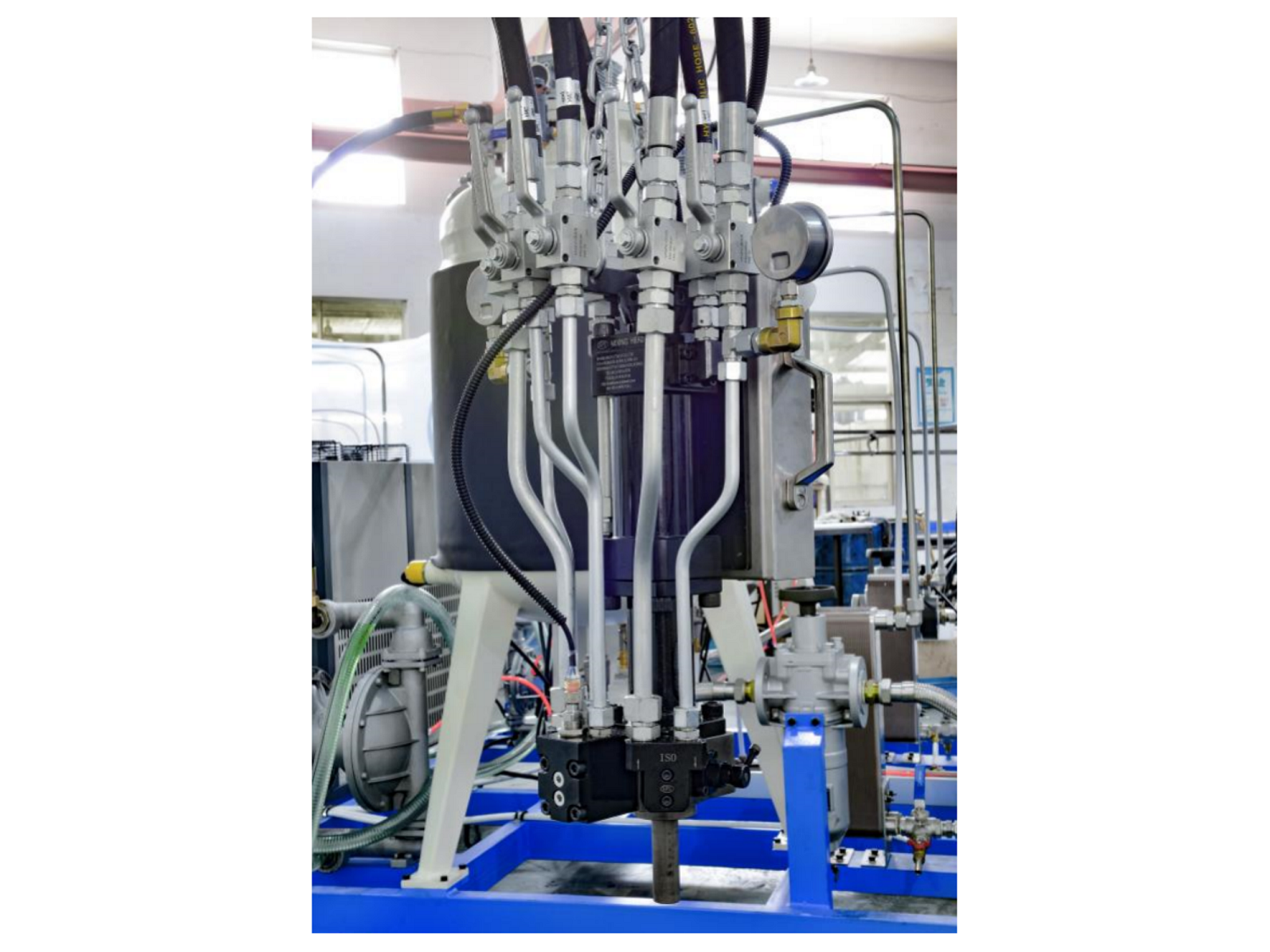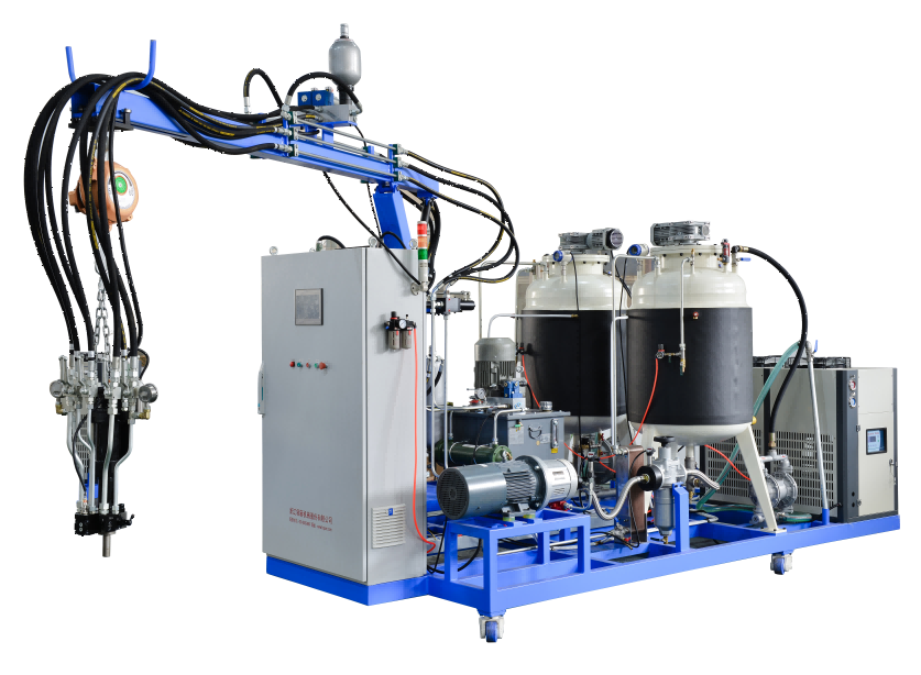 二組份聚氨酯高壓發(fā)泡機(jī)是將A料多元醇與B料異氰酸酯兩組份原料分別儲存在兩個儲料罐中,通過兩臺高精度柱塞計 量泵輸送至混合槍頭,兩物料通過高壓霧化對射進(jìn)行混合,高壓霧化碰撞混合的效果非常好,物料混合極其均勻,泡孔非常細(xì)膩,制品質(zhì)量非常穩(wěn)定可靠。